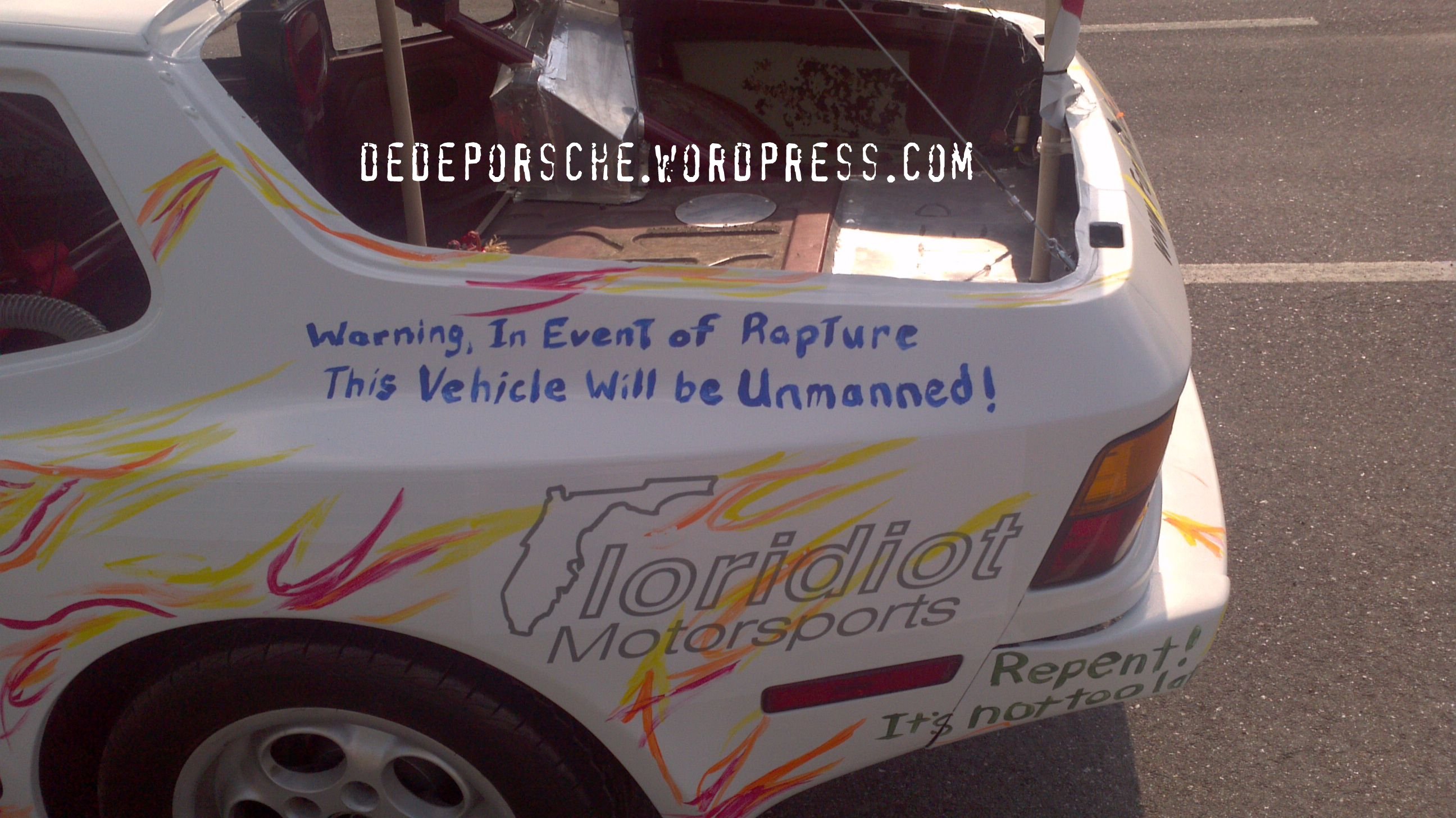 “In case of Rapture, this Porsche will be unmanned, a-rockin’, don’t come a-knockin’ …driver will be unarmed, unlegged, unheaded, untorsoed…”