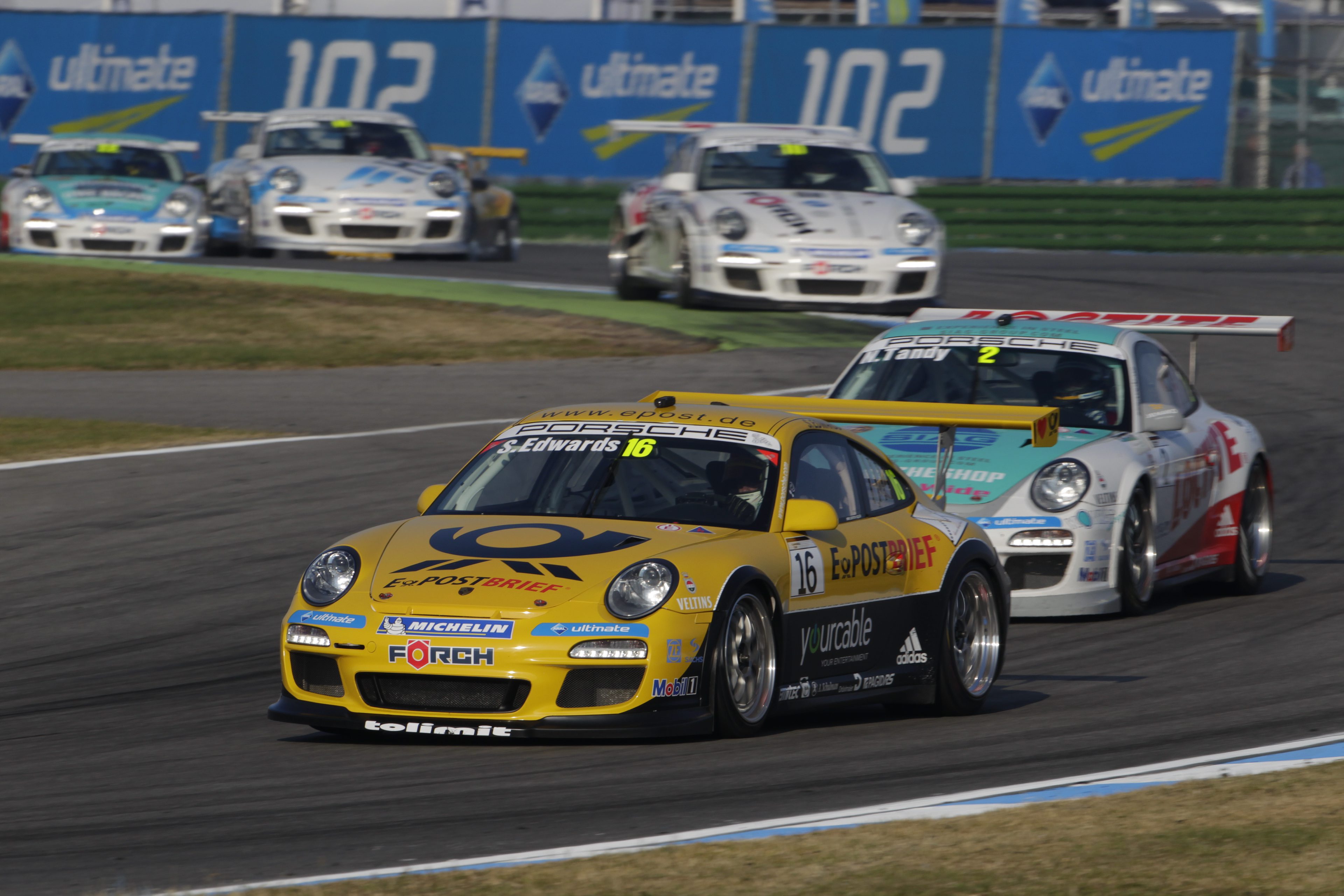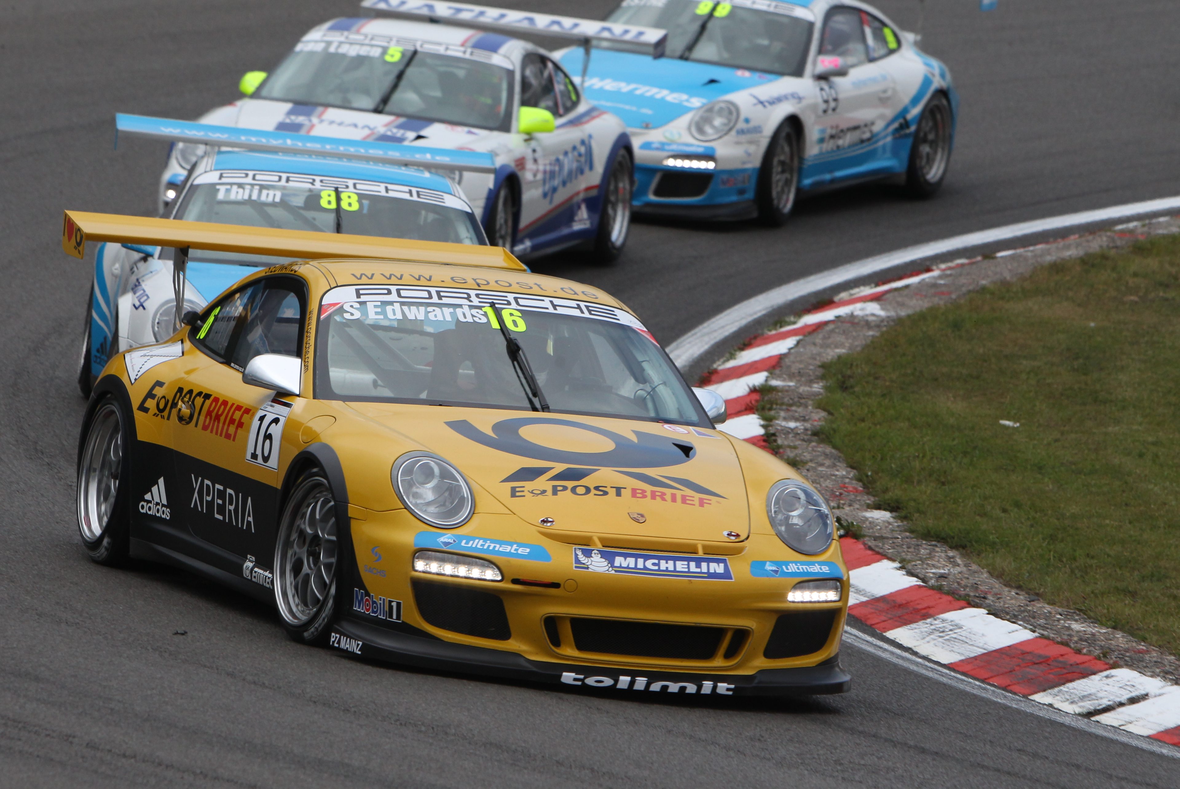 At the second race in the Eifel, this time on the Grand Prix course, the table turns. While in the lead, Edwards’s Porsche 911 GT3 Cup suffers a puncture in the final lap.