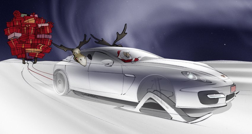 Dashing through the snow…..in a 500 hp @ 6,000 rpm open Panamera Turbo Sleigh…..o’er the fields we go, drifting all the way…….exhaust notes ringing, making spirits bright….Oh what fun it is to drive a Panamera Turbo Sleigh tonight !…Oh Jingle bells, Jingle bells…Jingle 188 mph all the way.