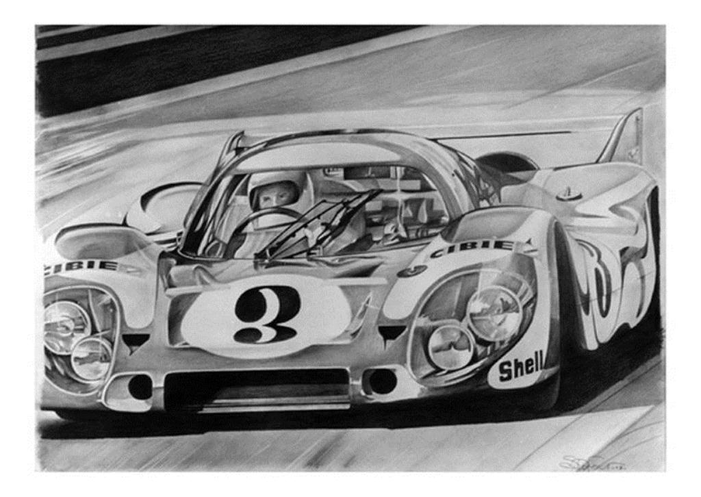 These paintings and drawings of epic Porsches, Le Mans prototypes and exceptional 911s, guaranty him an international acclaim.